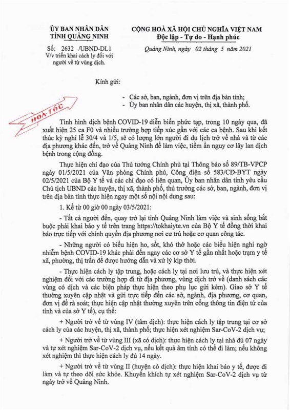 Ngày 2/5, UBND tỉnh Quảng Ninh đã ban hành văn bản số 2632/UBND-DL1 triển khai cách ly đối với người đến, về từ vùng dịch từ 0h ngày 3/5.