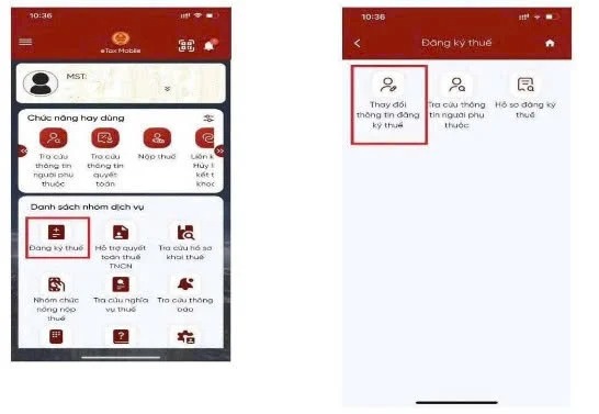 Sau khi đăng nhập vào hệ thống thành công, chọn menu Đăng ký thuế - Thay đổi thông tin: