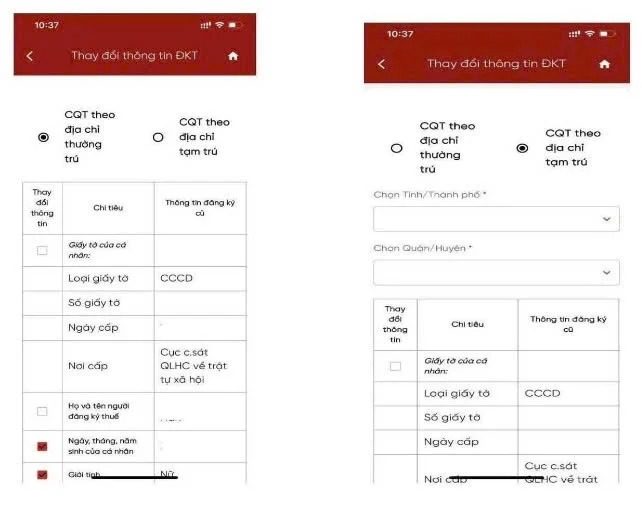 + Trường hợp NNT tích chọn thay đổi thông tin “Địa chỉ nơi thường trú", tờ khai được gửi tới CQT ứng với huyện theo thông tin đăng ký thuế mới nhận từ Cơ sở dữ liệu Quốc gia về dân cư.