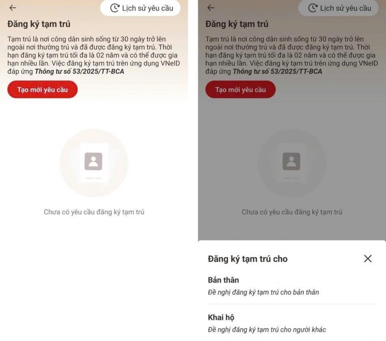 - Nhấn nút "Tạo mới yêu cầu" tại giao diện tiếp theo, sau đó chọn "Bản thân" để đăng ký thông tin cho chính mình và "Khai hộ" trong trường hợp cần đăng ký giúp người khác.