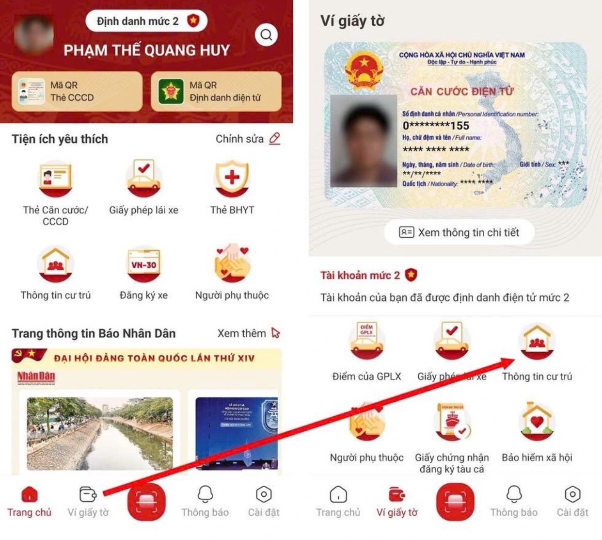 - Từ giao diện chính của ứng dụng, chọn “Ví giấy tờ” từ menu bên dưới, sau đó tìm và chọn “Thông tin cư trú” tại danh sách hiện ra. Ngoài ra, bạn cũng có thể chọn “Thông tin cư trú” tại mục “Tiện ích yêu thích” ngay trên giao diện chính của VNeID.