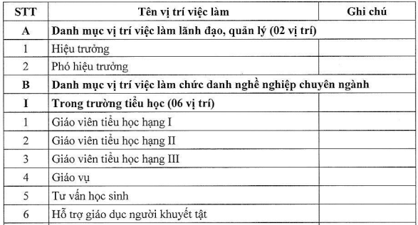 Thông tư số 20/2023/TT-BGDĐT quy định rõ danh mục vị trí việc làm, hướng dẫn mô tả vị trí việc làm trong trường tiểu học, trường phổ thông dân tộc bán trú tiểu học, trường dành cho người khuyết tật cấp tiểu học (gọi chung là trường tiểu học). Cụ thể như sau: