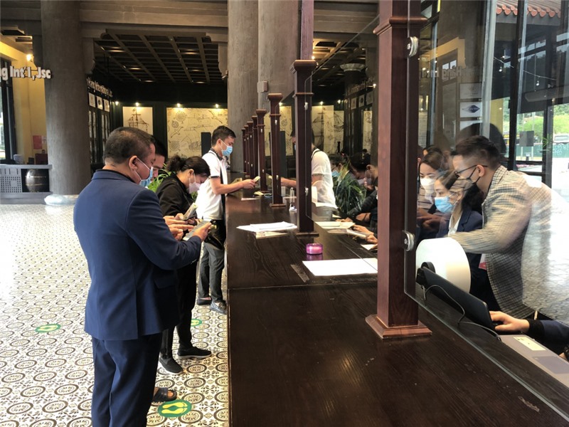 Du khách làm thủ tục tham quan vịnh Hạ Long tại quầy bán vé của Cảng tàu khách quốc tế Hạ Long.