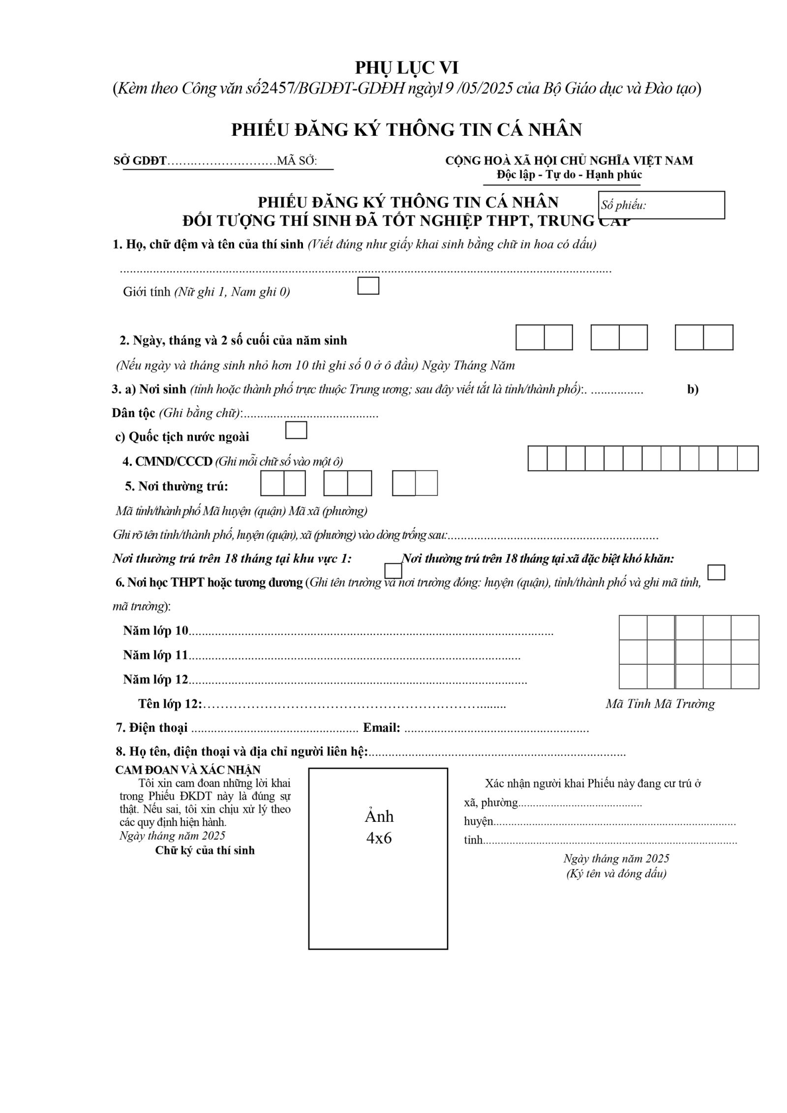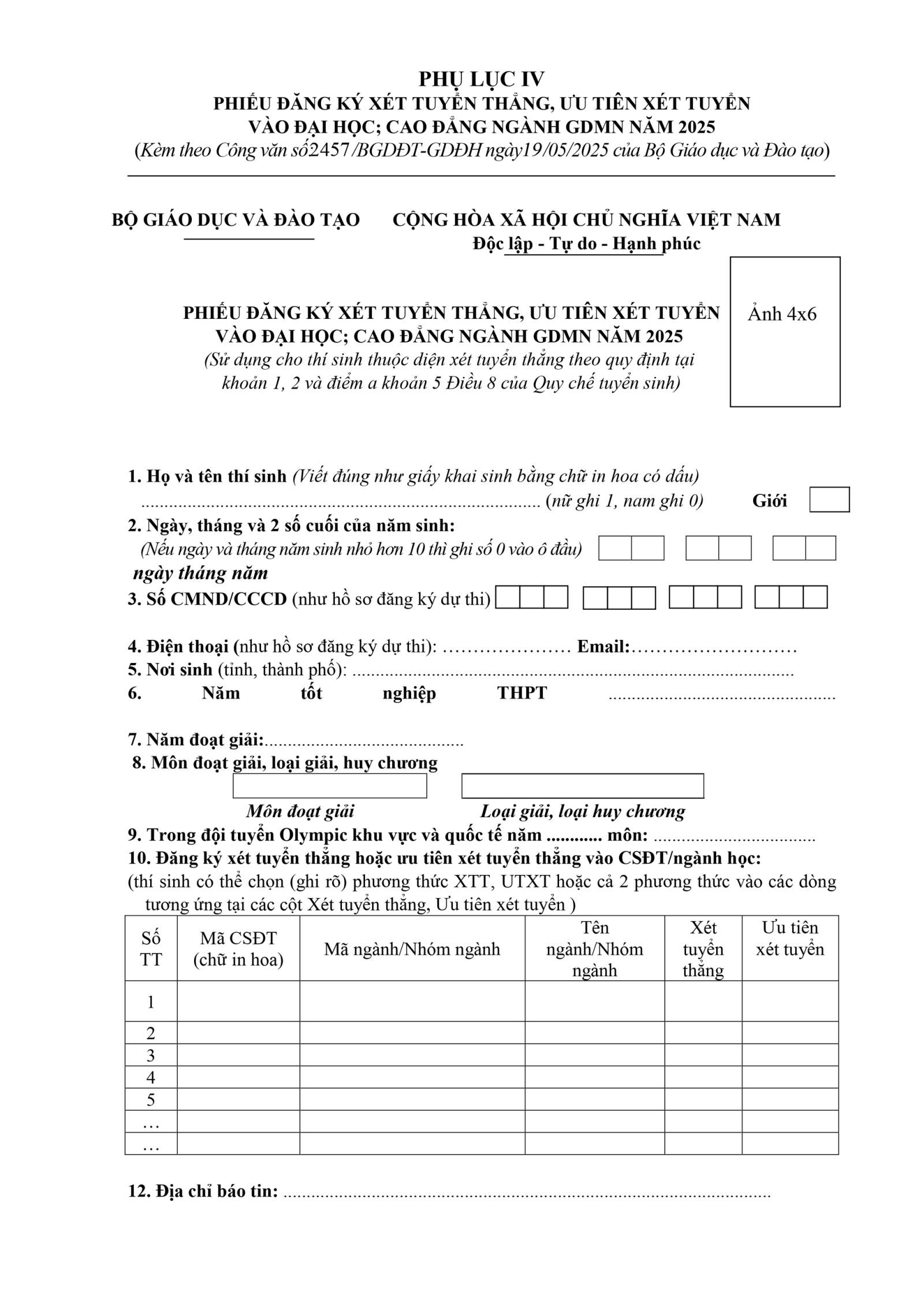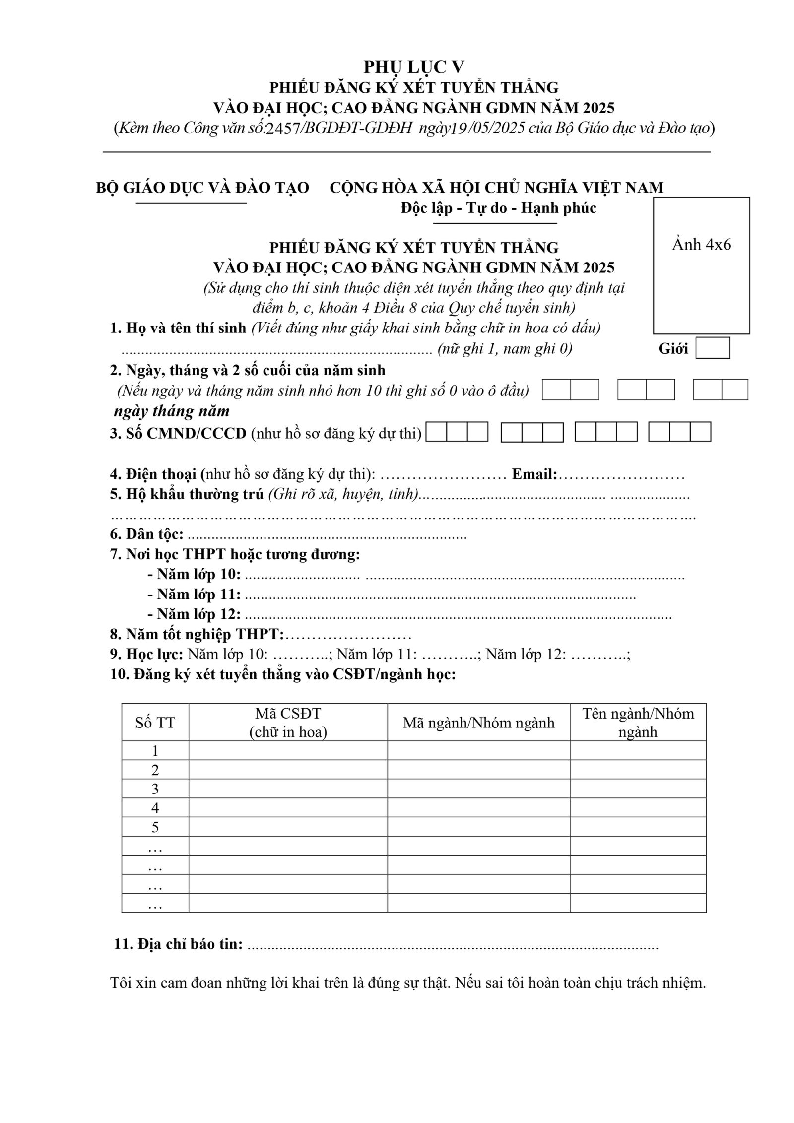 Bộ Giáo dục và Đào tạo ban hành Công văn 2457/BGDĐT-GDĐH ngày 19/5/2025 hhướng dẫn tuyển sinh đại học, tuyển sinh cao đẳng năm 2025.