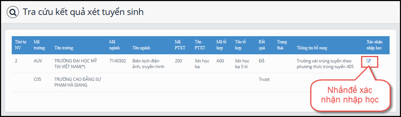 Bước 6: Kiểm tra lại trạng thái Đã nhập học