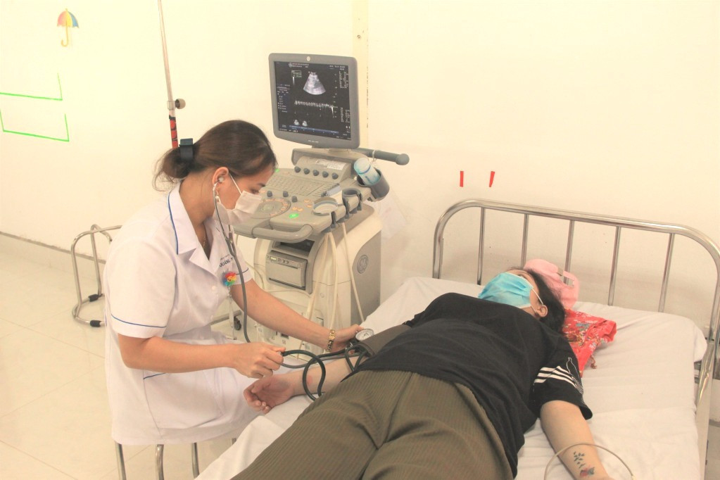 Nhân viên y tế Bệnh viện Sản Nhi Quảng Ninh khám thai, đánh giá tình trạng thai nhi trước khi tiêm vắc-xin cho phụ nữ mang thai.