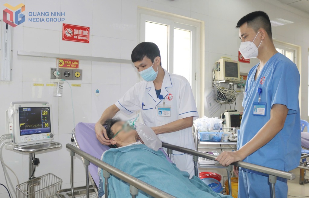 Điều dưỡng Bùi Thọ Luân (đứng bên trái) cùng bác sĩ khoa Cấp cứu, Bệnh viện Việt Nam - Thụy Điển Uông Bí chăm sóc cho người bệnh.