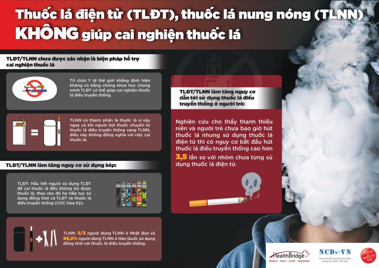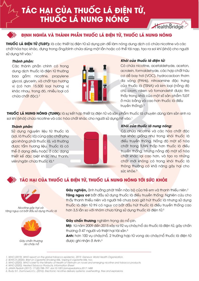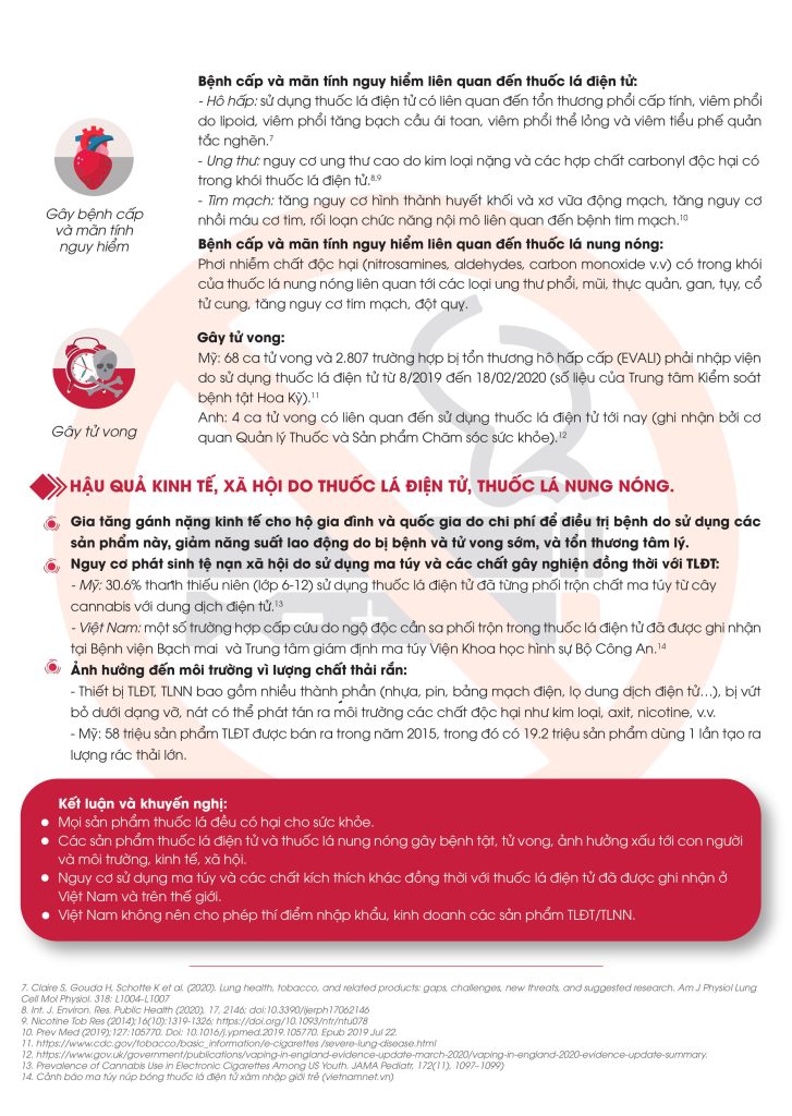Bên cạnh các sản phẩm thuốc lá điếu, xì gà, thuốc lá sợi (thuốc lào) đang được quản lý theo quy định của Luật phòng, chống tác hại của thuốc lá, trên thị trường đã đang xuất hiện các sản phẩm mới, phổ biến nhất là thuốc lá điện tử (Electronic Nicotine Delivery – ENDs) và thuốc lá làm nóng (Heated Tobacco Product – HTPs). Cả hai loại sản phẩm thuốc lá điện tử này đều sử dụng thiết bị điện tử để làm nóng dung dịch hoặc nguyên liệu thuốc lá tạo ra làn hơi khóiđể người dùng hút vào.Hiện nay Luật Phòng, chống tác hại của thuốc lá không quy định về các sản phẩm “thuốc lá điện tử”, “thuốc lá nung nóng” vì vậy các sản phẩm này chưa được phép nhập khẩu, kinh doanh và lưu hành hợp pháp tại Việt Nam.Thuốc lá điện tử có chứa nicotin là một hoá chất gây nghiện cao, là một nguyên nhân gây ra các bệnh về tim mạch, hô hấp, tiêu hóa, và có khả năng thúc đẩy, hình thành các khối u”[5]. Ngoài nicotin, dung dịch thuốc lá điện tử còn có propylene glycol, có thể tạo thành propylene oxide, một chất gây ung thư khi được đun nóng và hóa hơi. Các chất độc hại được tìm thấy trong sol khí (khói) của thuốc lá điện tử như Ethylene Glycol, aldehydes, hydrocacbon thơm đa vòng, chất đặc biệt gây ung thư nitrosamines, Formaldehyde… được tìm thấy trong thuốc trừ sâu, khói xe ô tô…. Một số kim loại như chì, bạc, crom, nikel, formaldehyde có hàm lượng tương đương hoặc cao hơn so với thuốc lá thông thường.[6] Vì vậy thuốc lá điện tử gây hại cho người sử dụng và những người xung quanh.[7].Để tạo mùi vị hấp dẫn, thu hút người sử dụng, đặc biệt là giới trẻ, các nhà sản xuất còn sử dụng rất nhiều loại hương liệu có mùi vị như: bạc hà, táo, cam, chanh….trong thuốc lá điện tử. Theo Tổ chức Y tế thế giới, hiện khoảng 20,000 loại hương liệu, trong đó có nhiều loại chưa được đánh giá toàn diện về mức độ gây hại với sức khỏe.Theo Tổ chức Y tế thế giới mọi sản phẩm thuốc lá đều có hại cho sức khỏe. Sử dụng thuốc lá điện tử gây nghiện nhanh chóng cho người sử dụng, đặc biệt ở những người trẻ tuổi, gây các bệnh cấp tính và mãn tính như bệnh tim mạch, đột quỵ, hô hấp, tiêu hóa, ngộ độc, động kinh, các bệnh về răng miệng và ung thư. Tiếp xúc thụ động với nicotine trong các sản phẩm này cũng gây tác động bất lợi cho sức khỏe bà mẹ và bào thai, ảnh hưởng xấu đối với sự phát triển não bộ bào thai, trẻ em và vị thành niên. Ghi nhận tại một số quốc gia đến thời điểm hiện tại cho thấy sử dụng thuốc lá điện tử gây bệnh cấp và mãn tính nguy hiểm, đặc biệt có liên quan đến hội chứng tổn thương phổi cấp tính. Tại Mỹ, năm 2019 một loạt trường hợp tổn thương phổi nghiêm trọng ở những người sử dụng thuốc lá điện tử được phát hiện. Số ca bệnh tiếp tục tăng và đạt đỉnh 2.807 ca nhập viện vào tháng 2 năm 2020, trong đó có 68 ca tử vong.Thuốc lá điện tử có sử dụng nhiều hương liệu, hóa chất với các thiết kế đa dạng nên có thể bị lợi dụng để pha trộn ma túy và các chất gây nghiện khác. Thuốc lá điện tử, thuốc lá làm nóng hiện có xu hướng nhắm tới đối tượng là giới trẻ thông qua hình ảnh, phong cách tạo gu thẩm mỹ, xu hướng của giới trẻ, bán hàng qua mạng (bán qua app điện thoại thông minh, quảng cáo và mua bán trên internet ) là hình thức mà giới trẻ thường sử dụng, ảnh hưởng xấu đến sức khỏe, môi trường, lối sống, hành vi của giới trẻ. Tại Việt Nam, thời gian gần đây, số trường hợp ngộ độc do sử dụng thuốc lá điện tử đã được ghi nhận ở nhiều tỉnh, thành phố. Đáng chú ý, hầu hết các trường hợp xảy ra ở lứa tuổi học sinh, trong đó có cả nữ giới.