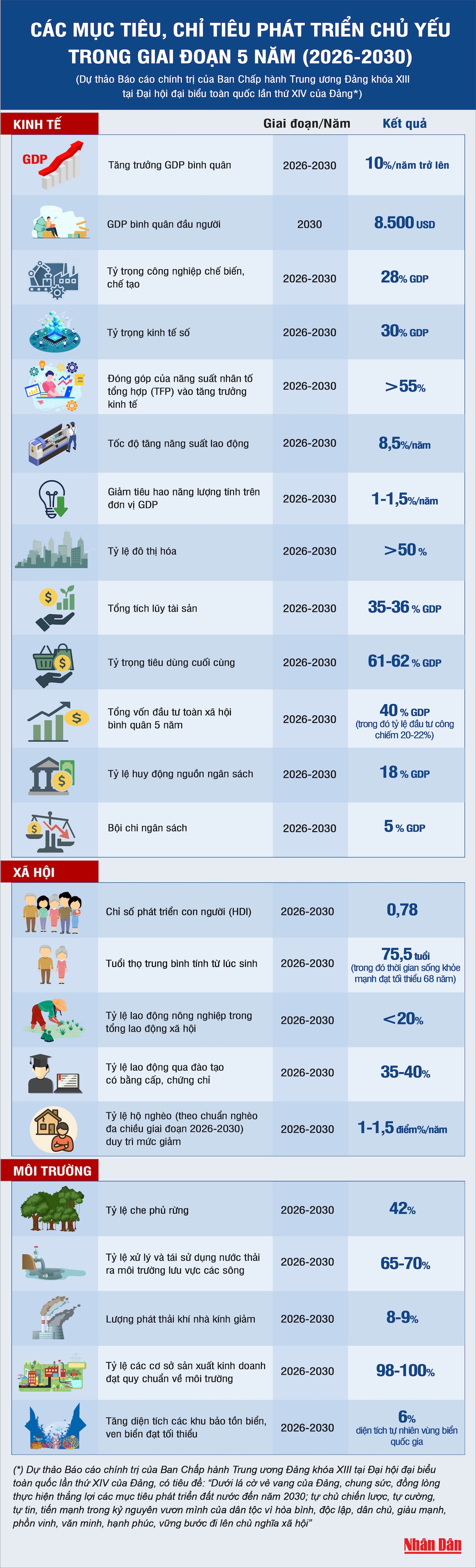 Một số mục tiêu, chỉ tiêu phát triển chủ yếu 5 năm 2026-2030 trong Dự thảo Báo cáo chính trị của Ban Chấp hành Trung ương Đảng khóa XIII tại Đại hội đại biểu toàn quốc lần thứ XIV của Đảng.