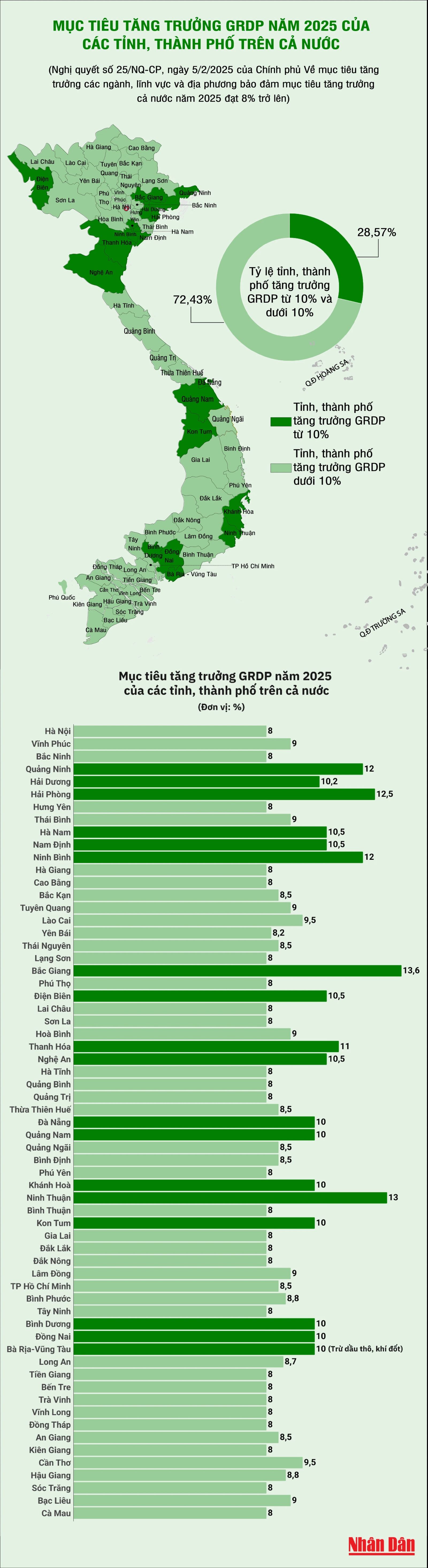 [Infographic] Mục tiêu tăng trưởng GRDP năm 2025 của các tỉnh, thành phố trên cả nước