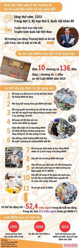 Dự án Luật Bảo hiểm xã hội (sửa đổi) trình lên Kỳ họp thứ 6, Quốc hội khóa XV, hiện có 10 chương và 136 điều. Theo lịch làm việc của Quốc hội, sáng ngày 23/11, các đại biểu Quốc hội sẽ thảo luận ở hội trường về dự án Luật quan trọng này.