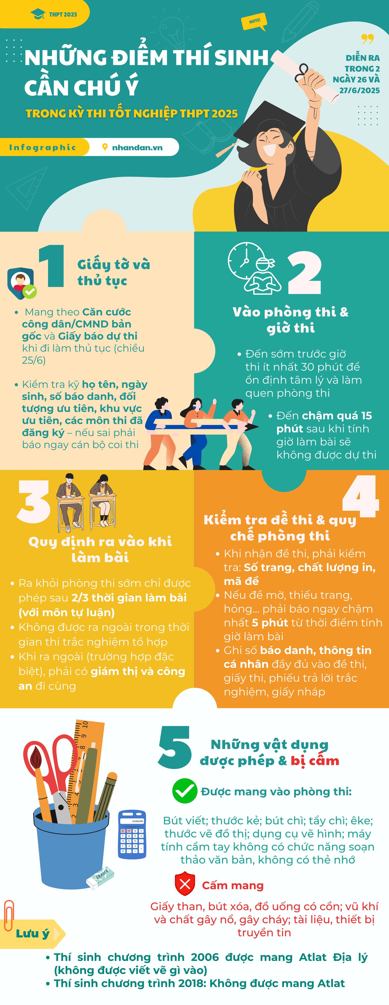 Kỳ thi tốt nghiệp trung học phổ thông năm 2025 diễn ra trong 2 ngày 26 và 27/6/2025. Để kỳ thi diễn ra suôn sẻ, sĩ tử cần lưu ý một số điều sau đây.