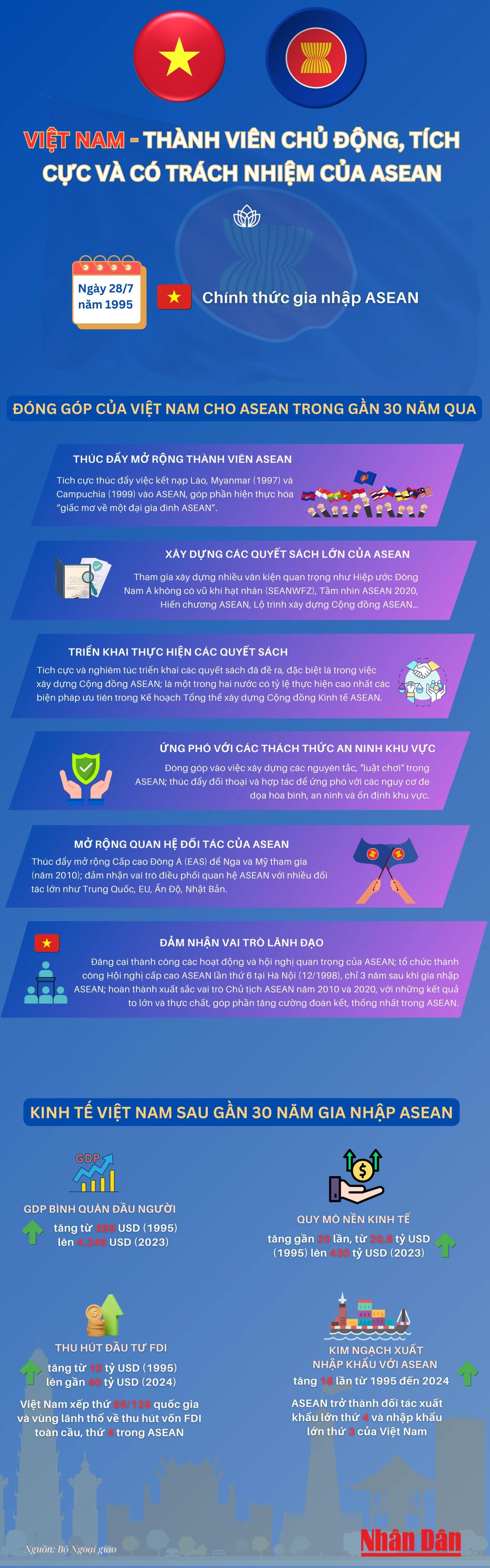 Kể từ khi gia nhập ASEAN ngày 28/7/1995, Việt Nam đã tham gia sâu rộng vào tất cả các lĩnh vực hợp tác theo phương châm “chủ động, tích cực và có trách nhiệm”, đồng thời có những đóng góp quan trọng cho sự trưởng thành và lớn mạnh của ASEAN.