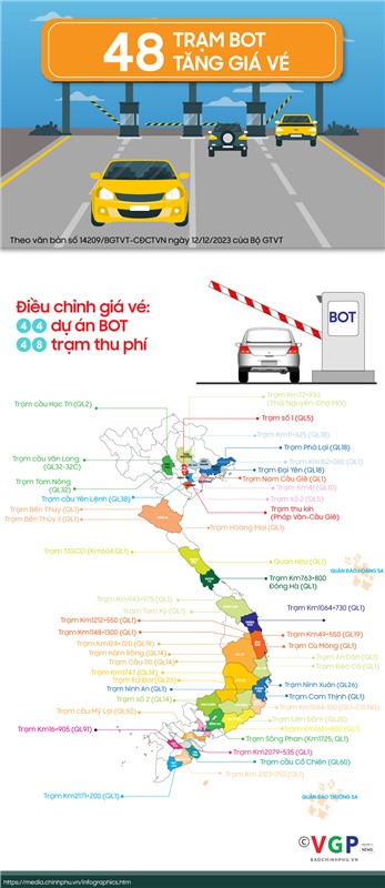 Ngày 12/12/2023, Bộ Giao thông vận tải có văn bản chấp thuận điều chỉnh giá vé của 44 dự án BOT/48 trạm thu phí. Cục Đường bộ Việt Nam thống nhất với DN dự án về mức giá, thời điểm điều chỉnh giá vé của từng dự án/trạm thu phí.