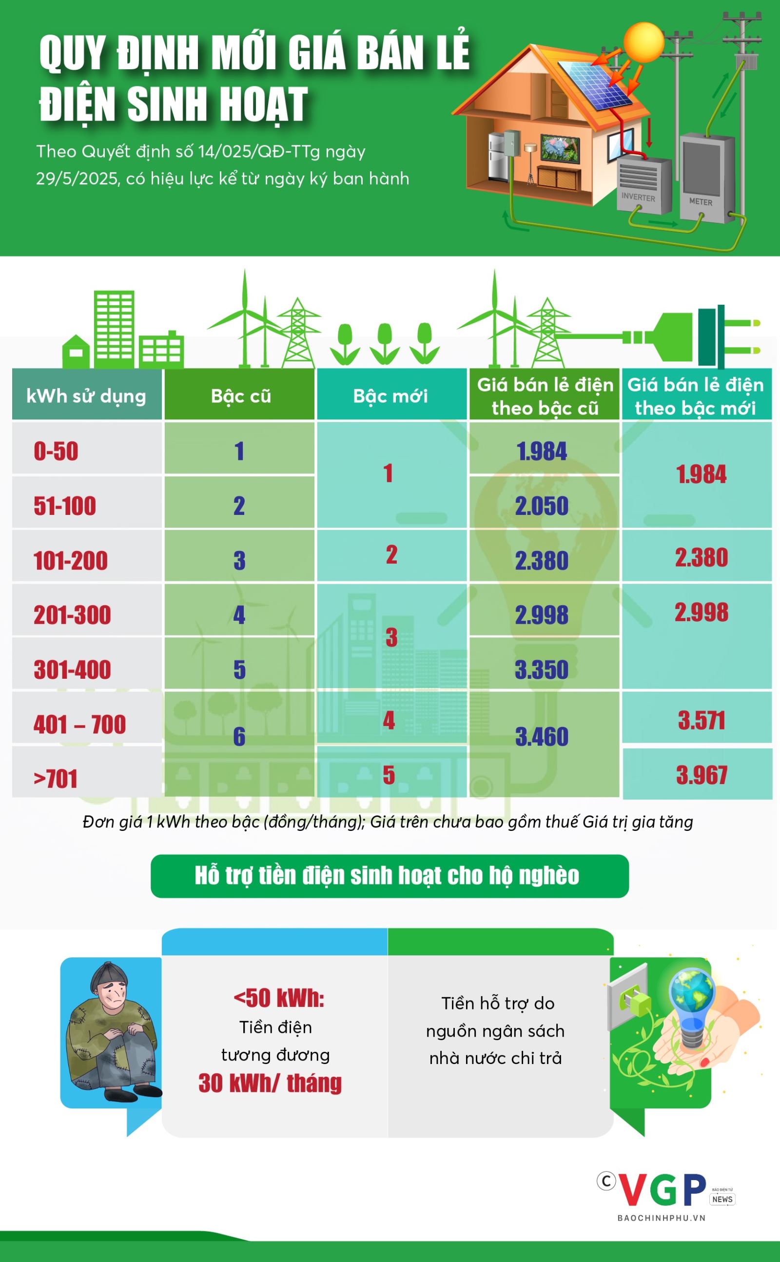 Chính phủ ban hành Quyết định số 14/2025/QĐ-TTg ngày 29/5/2025 quy định về cơ cấu biểu giá bán lẻ điện. Theo đó, giá bán lẻ điện cho nhóm khách hàng sử dụng điện mục đích sinh hoạt rút ngắn từ 6 xuống còn 5 bậc.