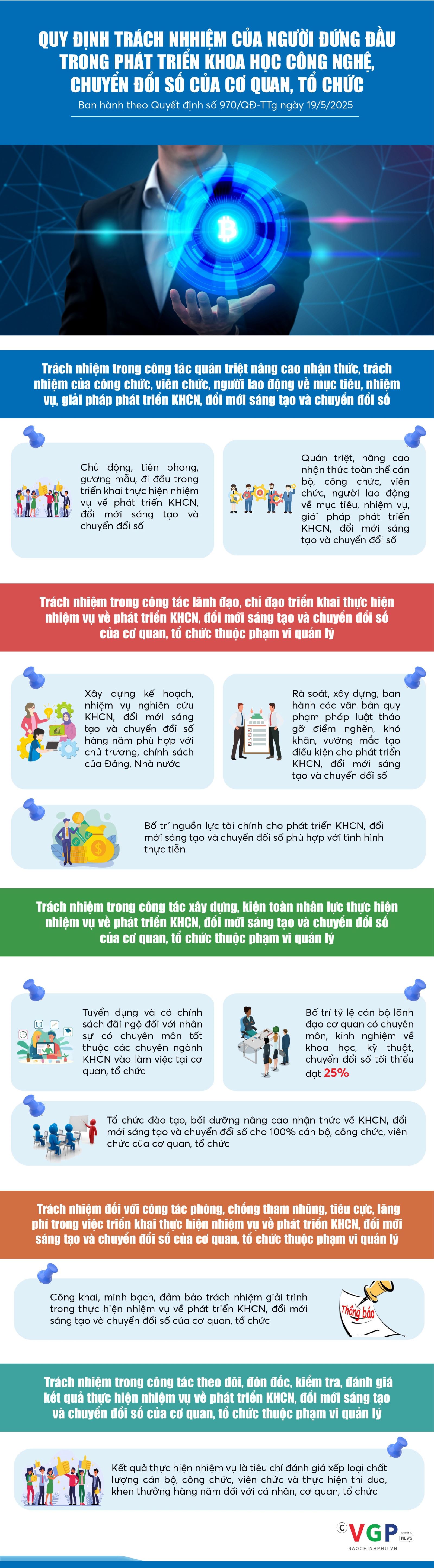 Infographics: Quy định trách nhiệm của người đứng đầu trong phát triển KHCN, chuyển đổi số của cơ quan, tổ chức