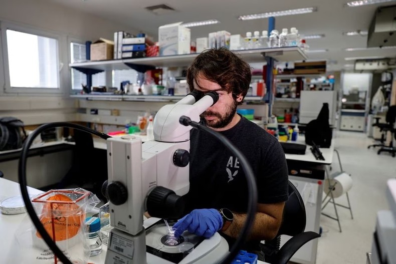 Nghiên cứu sinh Mehmet Yunus Comar quan sát mô hình phôi người giai đoạn đầu, được các nhà khoa học Israel tạo ra mà không sử dụng trứng, tinh trùng hoặc tử cung trong phòng thí nghiệm tại Viện Khoa học Weizmann ở Rehovot, Israel ngày 7/9. Ảnh: Reuters.