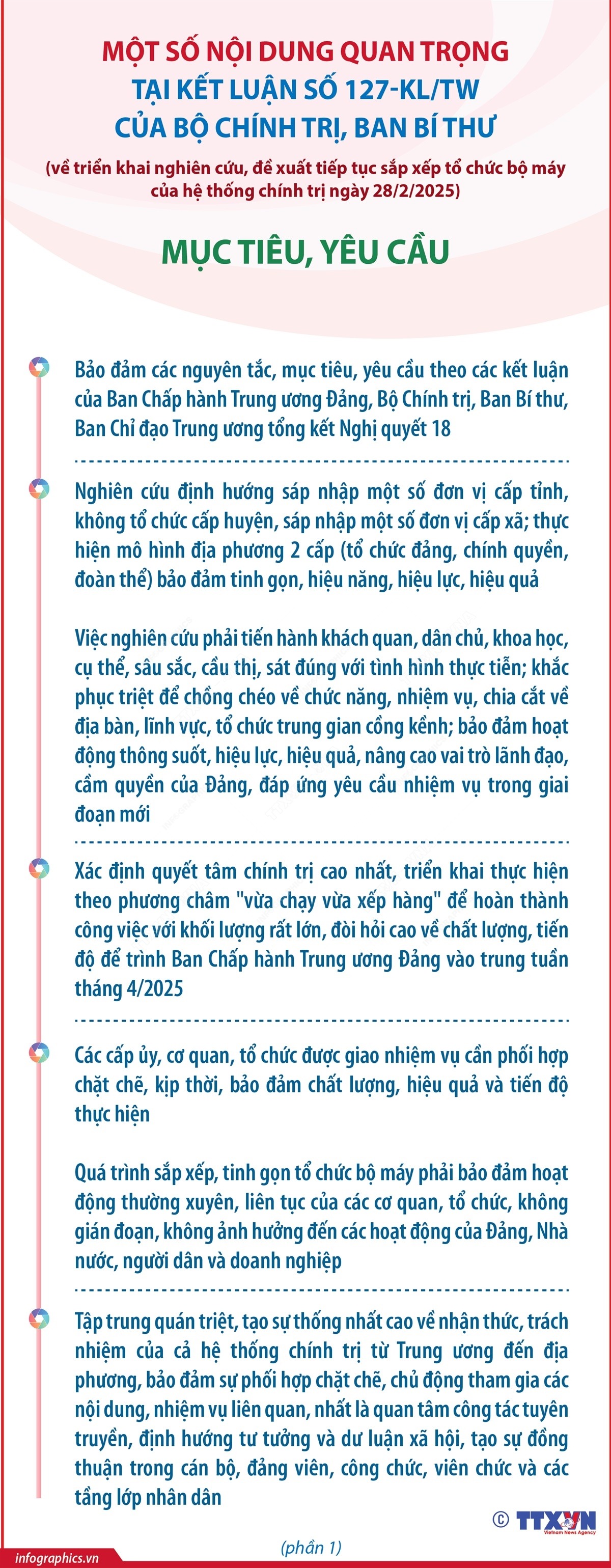 Tại phiên họp ngày 28/2/2025, sau khi nghe Ban Tổ chức Trung ương báo cáo về các nội dung, nhiệm vụ và tiến độ thời gian triển khai nghiên cứu, đề xuất tiếp tục sắp xếp tổ chức bộ máy của hệ thống chính trị theo chỉ đạo, kết luận của Trung ương, Bộ Chính trị (Công văn số 8011-CV/BTCTW, ngày 27/02/2025), Bộ Chính trị, Ban Bí thư có ý kiến như sau: