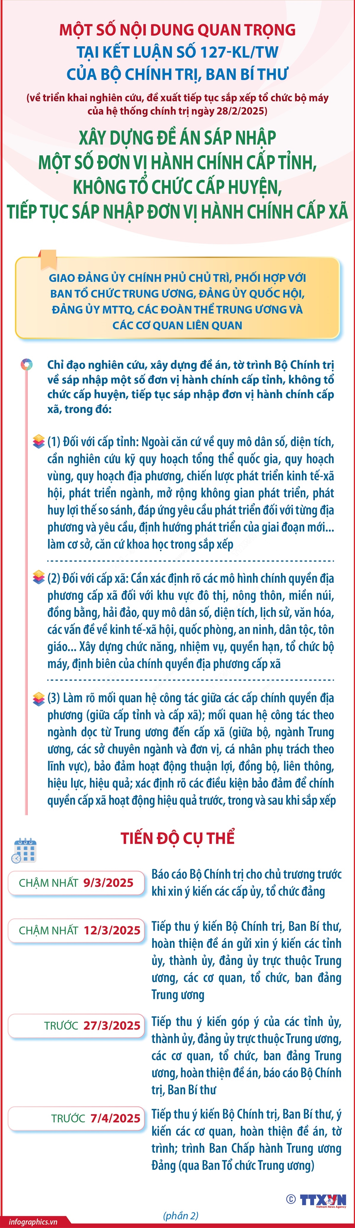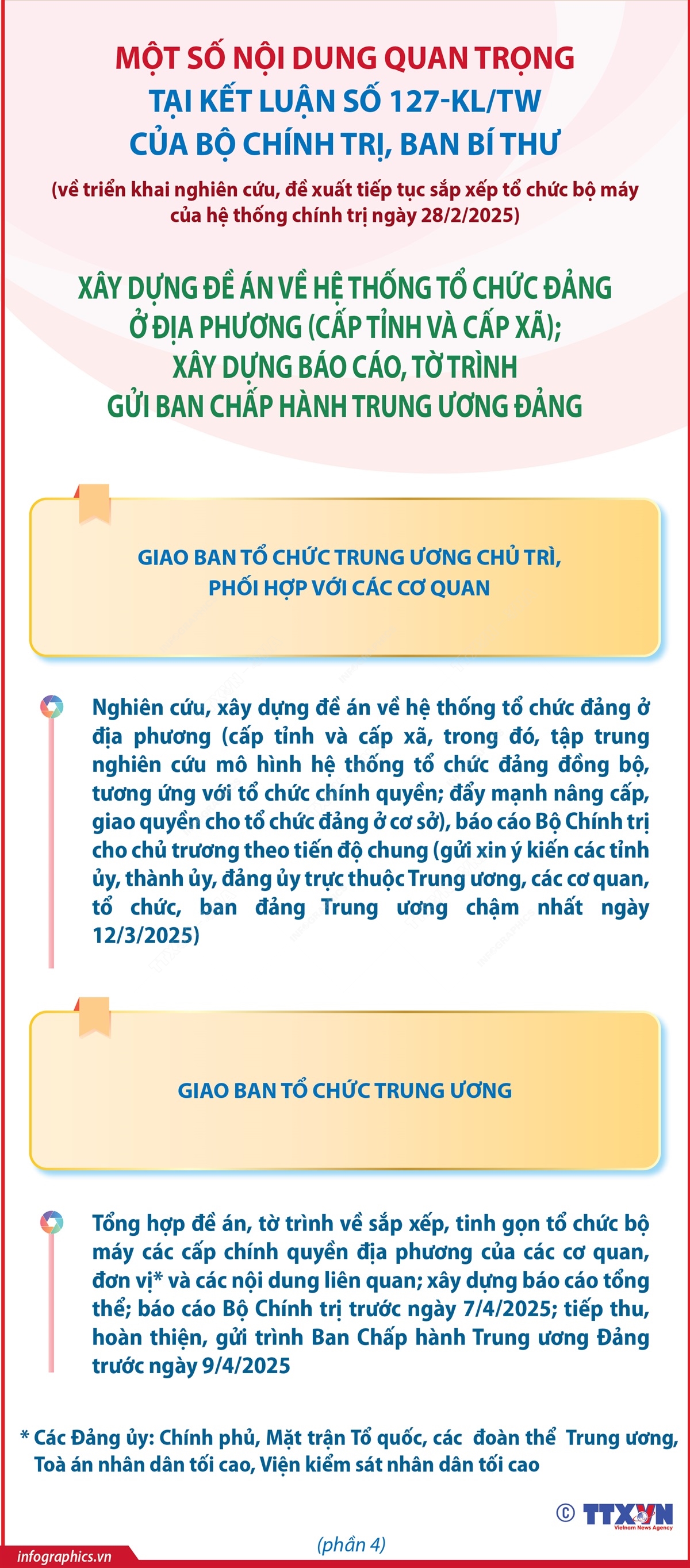 - Giao Ban Tổ chức Trung ương tổng hợp đề án, tờ trình về sắp xếp, tinh gọn tổ chức bộ máy các cấp chính quyền địa phương của các cơ quan, đơn vị (các Đảng uỷ: Chính phủ, Mặt trận Tổ quốc, các đoàn thể Trung ương, Toà án nhân dân tối cao, Viện Kiểm sát nhân dân tối cao) và các nội dung liên quan; xây dựng báo cáo tổng thể; báo cáo Bộ Chính trị trước ngày 07/4/2025; tiếp thu, hoàn thiện, gửi trình Ban Chấp hành Trung ương Đảng trước ngày 09/4/2025.