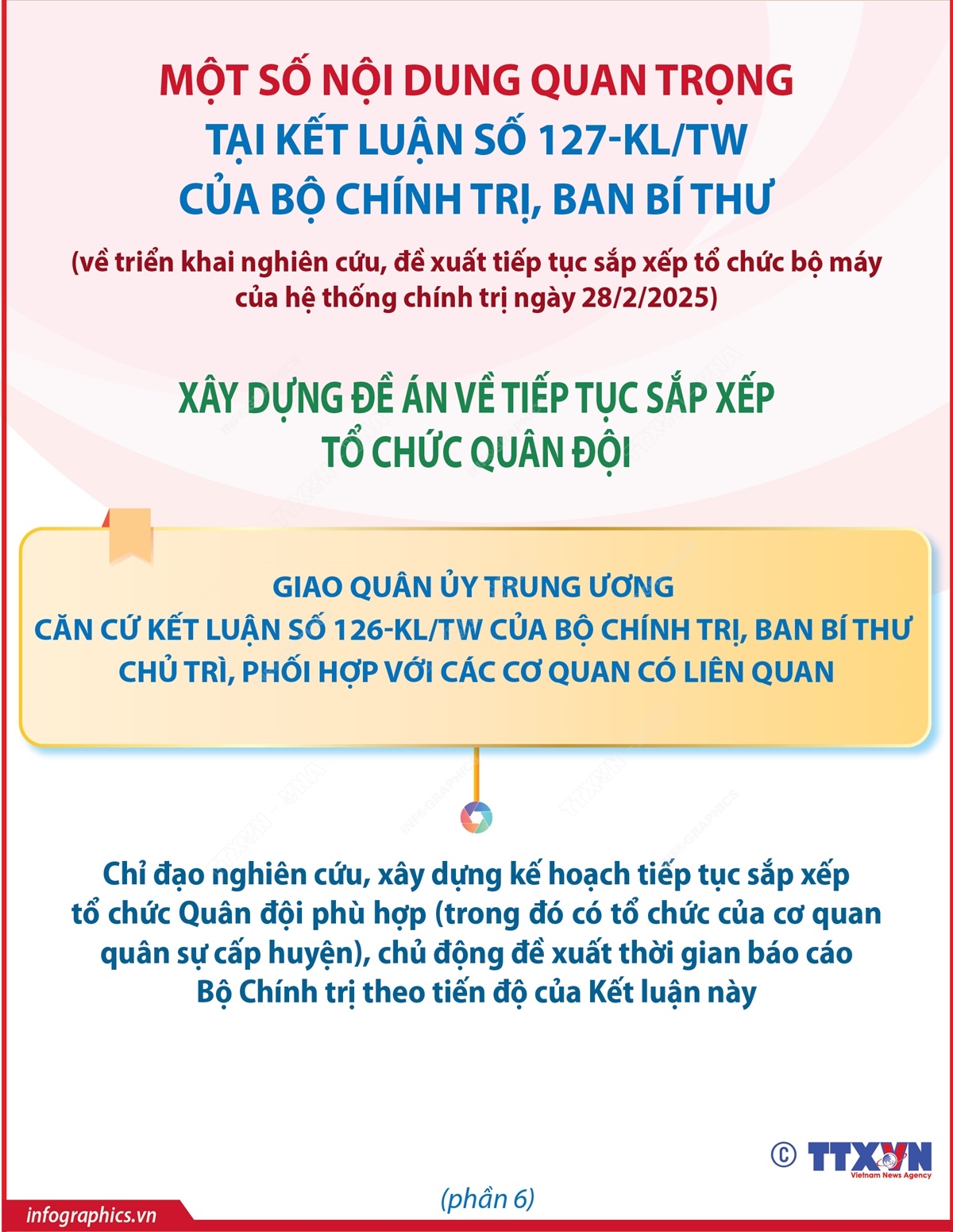 Giao Quân uỷ Trung ương căn cứ Kết luận số 126-KL/TW của Bộ Chính trị, Ban Bí thư chủ trì, phối hợp với các cơ quan có liên quan chỉ đạo nghiên cứu, xây dựng kế hoạch tiếp tục sắp xếp tổ chức Quân đội phù hợp (trong đó có tổ chức của cơ quan quân sự cấp huyện), chủ động đề xuất thời gian báo cáo Bộ Chính trị theo tiến độ của Kết luận này.