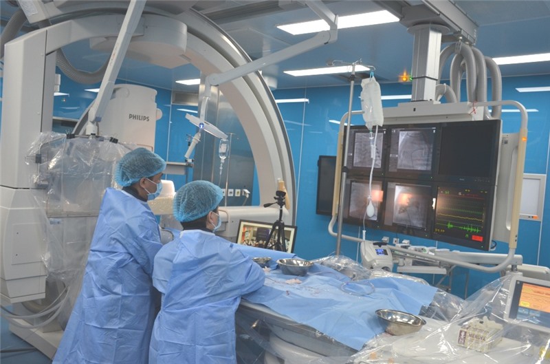 Can thiệp tim mạch cho bệnh nhi bằng hệ thống máy chụp mạch xóa nền kỹ thuật số 2 bình diện (DSA) tại Bệnh viện Sản Nhi Quảng Ninh. Ảnh: Nguyễn Hoa