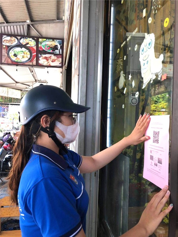 Đoàn viên thanh niên phường Phương Đông hỗ trợ tạo, niêm yết mã QR tại một cơ sở kinh doanh dịch vụ trên địa bàn.