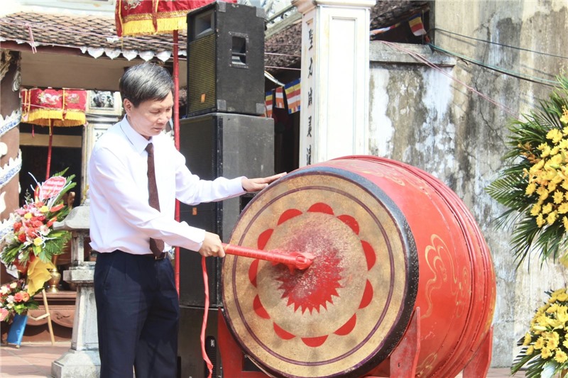 Phó Chủ tịch Thường trực UBND thành phố Nguyễn Văn Thành gióng trống khai hội Đình - Chùa Lạc Thanh năm 2022.