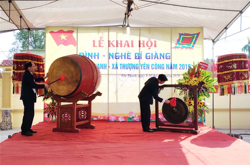 Đồng chí Trần Văn Lâm, Tỉnh ủy viên, Bí thư Thành ủy, Chủ tịch HĐND thành phố; đồng chí Nguyễn Mạnh Hà, Phó Bí thư Thành ủy, Chủ tịch UBND thành phố gióng trống thỉnh chiêng khai hội Đình - Nghè Bí Giàng năm 2019.