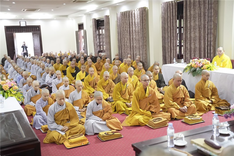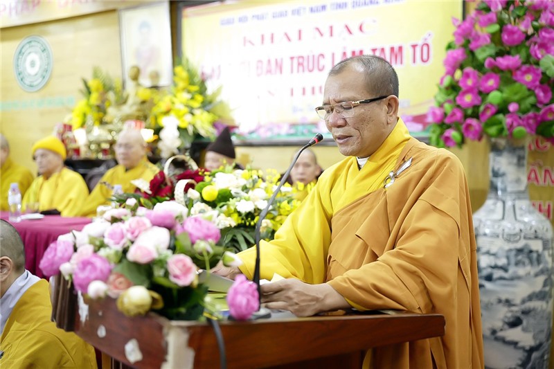 Thượng tọa Thích Đạo Hiển, Phó trưởng ban, Chánh Thư kí Ban Trị sự GHPGVN tỉnh thay mặt Ban Trị sự Phật giáo tỉnh báo cáo công tác tổ chức Đại giới đàn Trúc Lâm Tam Tổ lần thứ XIII.