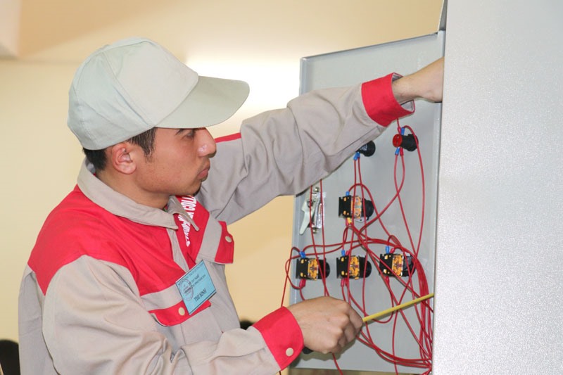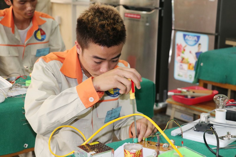Các thí sinh làm bài thi nghề lắp đặt điện.