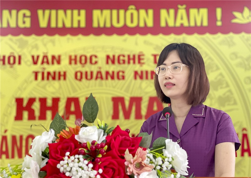 Nhà báo Trần Thuỳ Liên, PCT Hội VHNT tỉnh phát biểu tại chương trình.