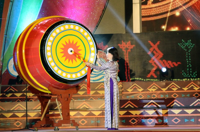 Đồng chí Vũ Thị Thu Thủy, Phó Chủ tịch UBND tỉnh gióng trống khai mạc Tuần văn hóa, thể thao các dân tộc vùng Đông Bắc tỉnh Quảng Ninh lần thứ II.