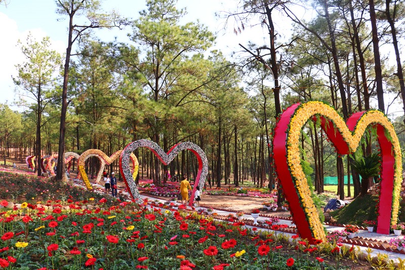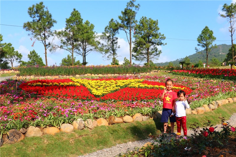 Đặc biệt, công viên có nhiều điểm nhấn tiểu cảnh độc đáo, hấp dẫn, làm nền để du khách chụp những bức ảnh ấn tượng, như: con đường tình yêu được kết bằng những trái tim hoa hồng cỡ lớn; những bình hoa, suối hoa duyên dáng, yêu kiều; thảm hoa tạo hình bản đồ chữ S, lá cờ Việt Nam tươi sáng...
