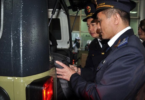 Lực lượng chức năng của Việt Nam kiểm tra và cấp phép cho xe ô-tô tự lái của khách du lịch qua cửa khẩu quốc tế Móng Cái.