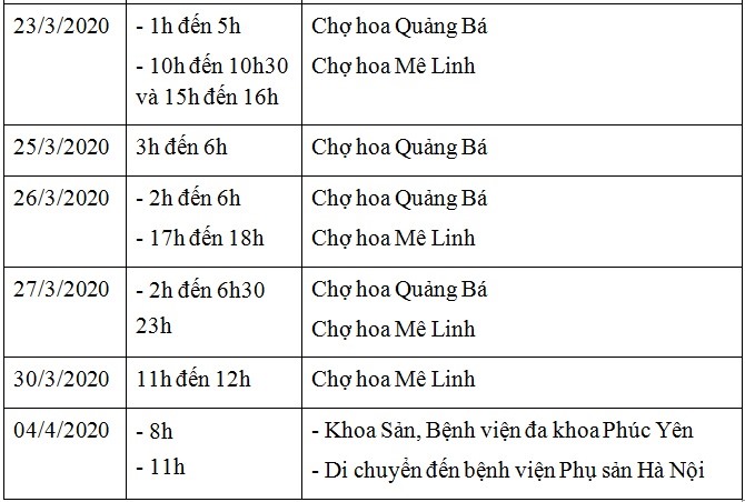 Bộ Y tế đề nghị tất cả người có mặt trong thời gian, địa điểm dưới đây cần liên hệ ngay với Trung tâm Kiểm soát Bệnh tật các tỉnh, thành phố để được hướng dẫn theo dõi sức khoẻ.