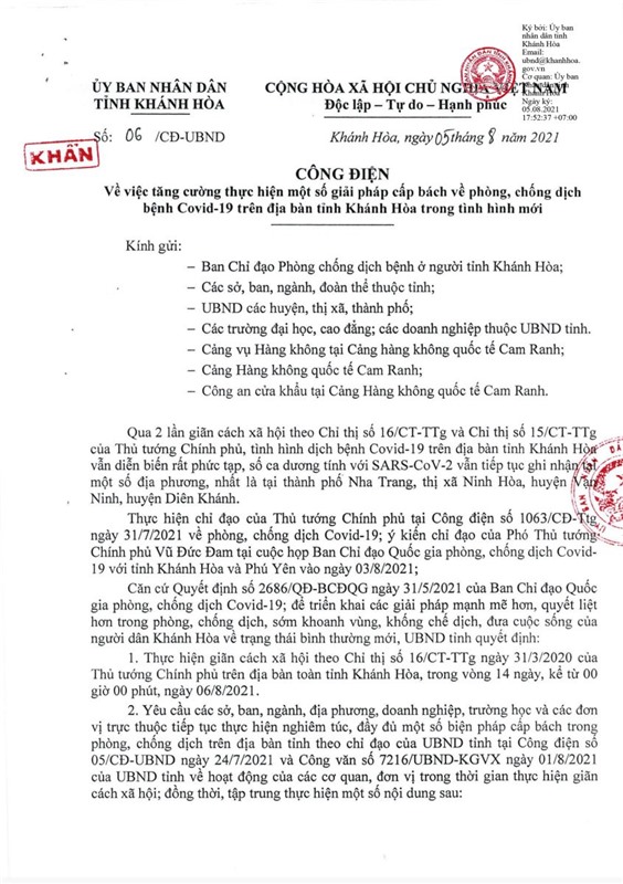 UBND tỉnh Khánh Hòa có công điện khẩn vào chiều 5/8 về việc tăng cường thực hiện một số giải pháp cấp bách về phòng, chống dịch COVID-19 tại tỉnh trong tình hình mới. Theo đó, Khánh Hòa sẽ thực hiện giãn cách xã hội theo Chỉ thị 16/CT-TTg của Thủ tướng Chính phủ trên toàn tỉnh trong vòng 14 ngày, kể từ 0h ngày 6/8.