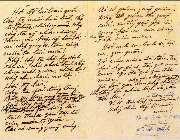 Bút tích "Lời kêu gọi Toàn quốc kháng chiến" của Chủ tịch Hồ Chí Minh ngày 19/12/1946. (Ảnh tư liệu)