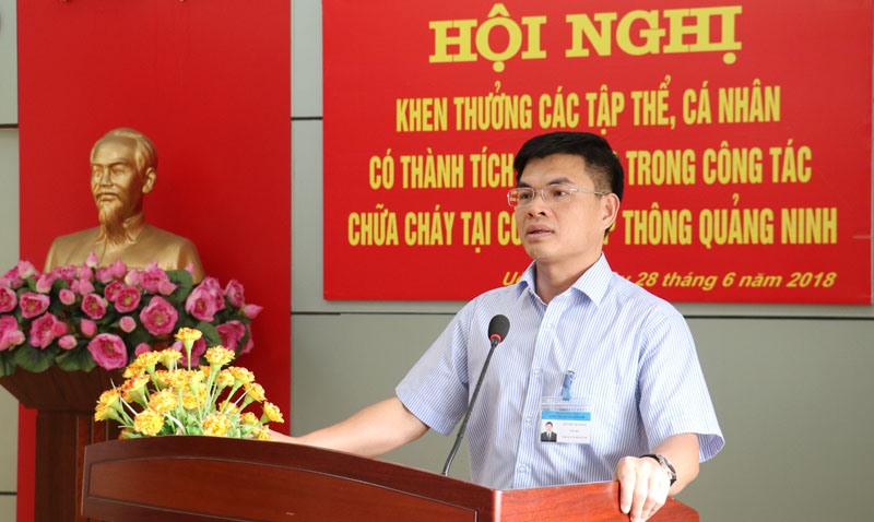 Đồng chí Trần Ngọc Thái, Trưởng phòng Cảnh sát PCCC số 4 báo cáo công tác chữa cháy tại Công ty Cổ phần thông Quảng Ninh.
