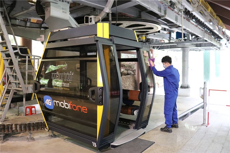 Nhân viên Khu di tích và danh thắng Yên Tử vệ sinh cabin cáp treo.
