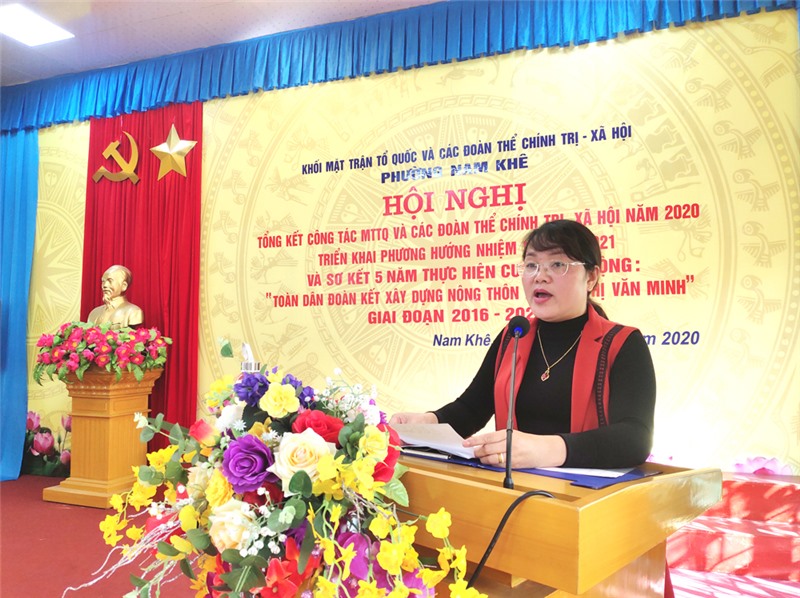 Ngày 21/12, Khối MTTQ và các đoàn thể chính trị - xã hội phường Nam Khê tổ chức hội nghị tổng kết công tác năm 2020, triển khai phương hướng, nhiệm vụ năm 2021; sơ kết 5 năm thực hiện cuộc vận động “Toàn dân đoàn kết xây dựng nông thôn mới, đô thị văn minh” giai đoạn 2015-2020.