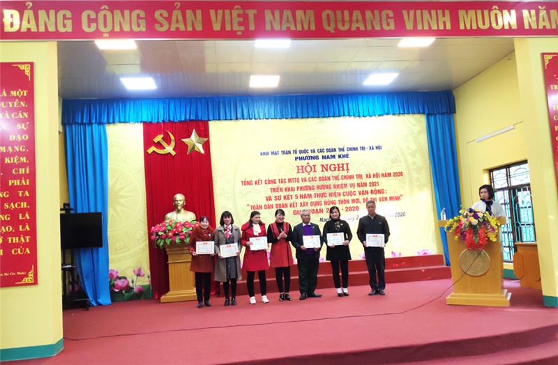 Tại hội nghị, Khối MTTQ và các đoàn thể chính trị - xã hội phường Nam Khê đã khen thưởng 30 tập thể và 21 cá nhân có thành tích xuất sắc trong năm 2020; khen thưởng các tập thể, cá nhân có thành tích xuất sắc trong 5 năm thực hiện cuộc vận động “Toàn dân đoàn kết xây dựng nông thôn mới, đô thị văn minh”.