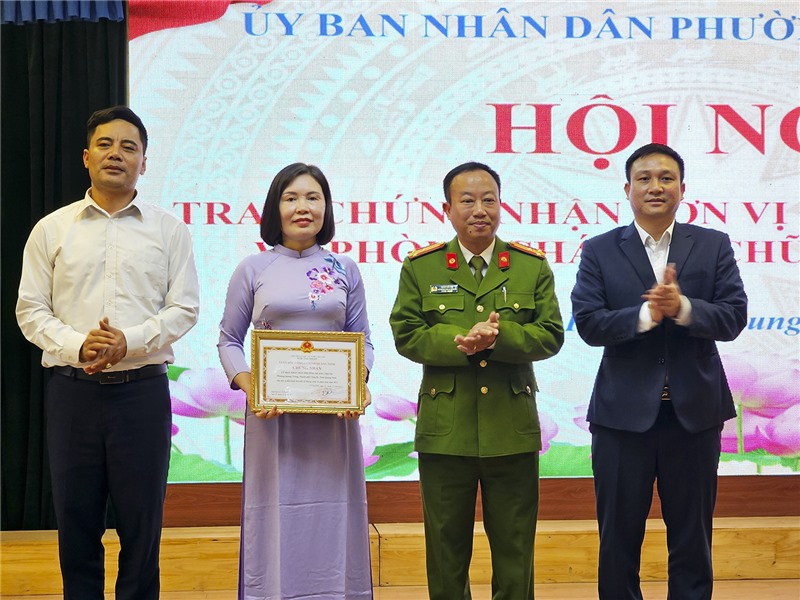 Trao Chứng nhận của Giám đốc công an tỉnh Quảng Ninh cho phường Quang Trung đã đạt "Đơn vị điển hình tiên tiến về Phòng cháy chữa cháy năm 2023".