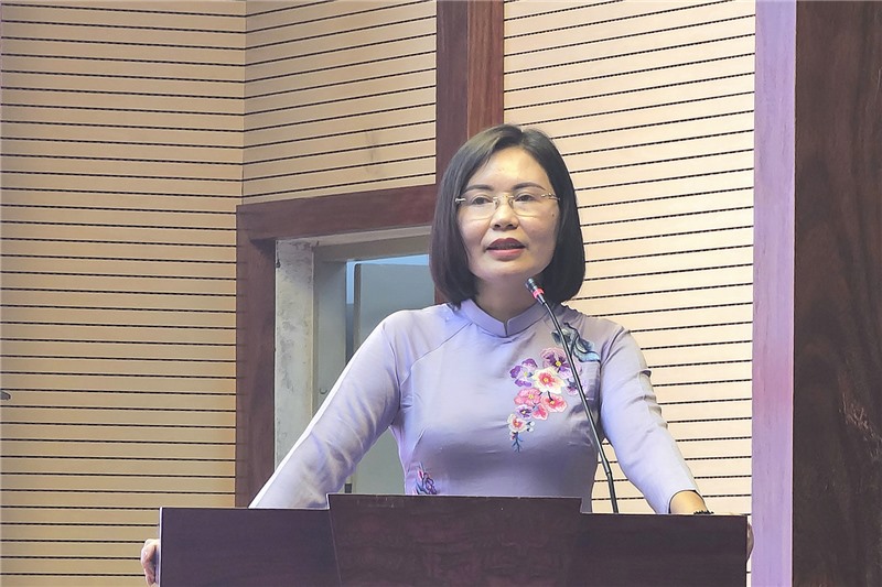 Đồng chí Vũ Thị Hồng Nhung, Thành ủy viên, Bí thư Đảng ủy phường Quang Trung phát biểu tại hội nghị.