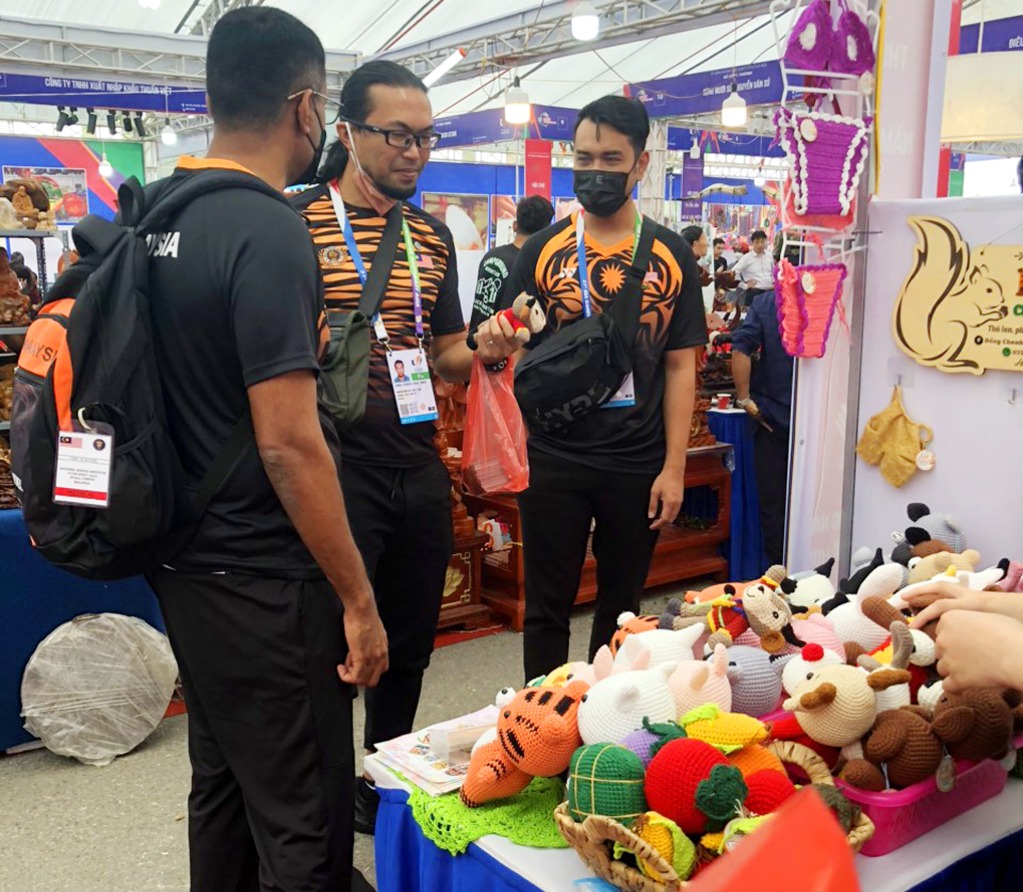 VĐV SEA Games 31 tại Quảng Ninh tham quan và mua quà lưu niệm bằng len móc thủ công tại quầy hàng của Đỗ Thùy Linh.