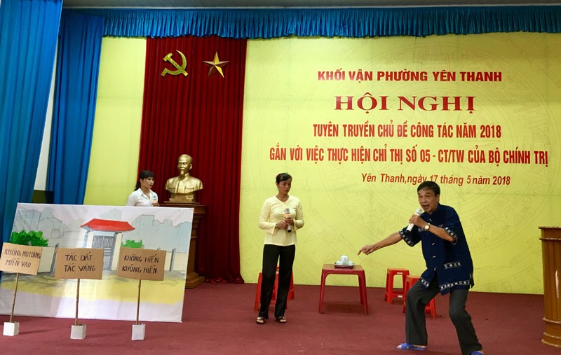 Năm 2018, thành phố Uông Bí lấy chủ đề công tác năm là “Tập trung công tác chỉnh trang đô thị; giải quyết đơn thư khiếu nại, tố cáo; bảo vệ và nâng cao chất lượng môi trường tự nhiên”. Tại hội nghị, những nội dung trên được lồng ghép tuyên truyền vào các tiểu phẩm ý nghĩa, như: câu chuyện giữ vệ sinh môi trường ở khu dân cư, hiến đất làm đường, giải quyết khiếu nại, tố cáo tại cơ sở… Từ đó, giúp cán bộ, nhân dân trên địa bàn nhận thức rõ vai trò, trách nhiệm trong thực hiện chủ đề công tác năm, gắn với thực hiện Chỉ thị số 05 “Về đẩy mạnh học tập và làm theo tư tưởng, đạo đức, phong cách Hồ Chí Minh”.