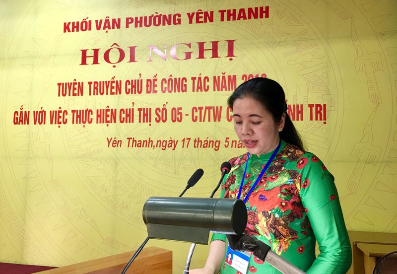 Chiều 17-5, Khối vận phường Yên Thanh tổ chức Hội nghị tuyên truyền chủ đề công tác năm 2018 gắn với thực hiện Chỉ thị số 05 - CT/TW của Bộ Chính trị về đẩy mạnh học tập và làm theo tư tưởng, đạo đức, phong cách Hồ Chí Minh cho cán bộ, đảng viên, nhân dân trên địa bàn.