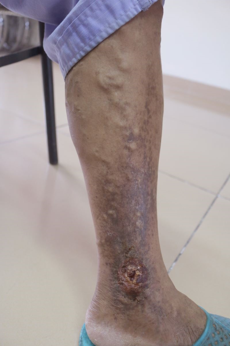 Ông Bùi Văn H. 69 tuổi, trú tại Đông Mai - Quảng Yên - Quảng Ninh nhập viện với vết lở loét vùng cẳng chân do suy giãn tĩnh mạch gây ra. Ông H. cho biết ông có hiện tượng đau tức chân nhiều năm nay, đã đi khám và phát hiện suy giãn tĩnh mạch, nhưng ông không điều trị. Chỉ đến thời gian gần đây tình trạng đau, tức chân tăng, chân nổi nhiều gân vằn và xuất hiện viêm loét vùng cẳng chân ông mới nhập viện Việt Nam - Thụy Điển Uông Bí để điều trị.