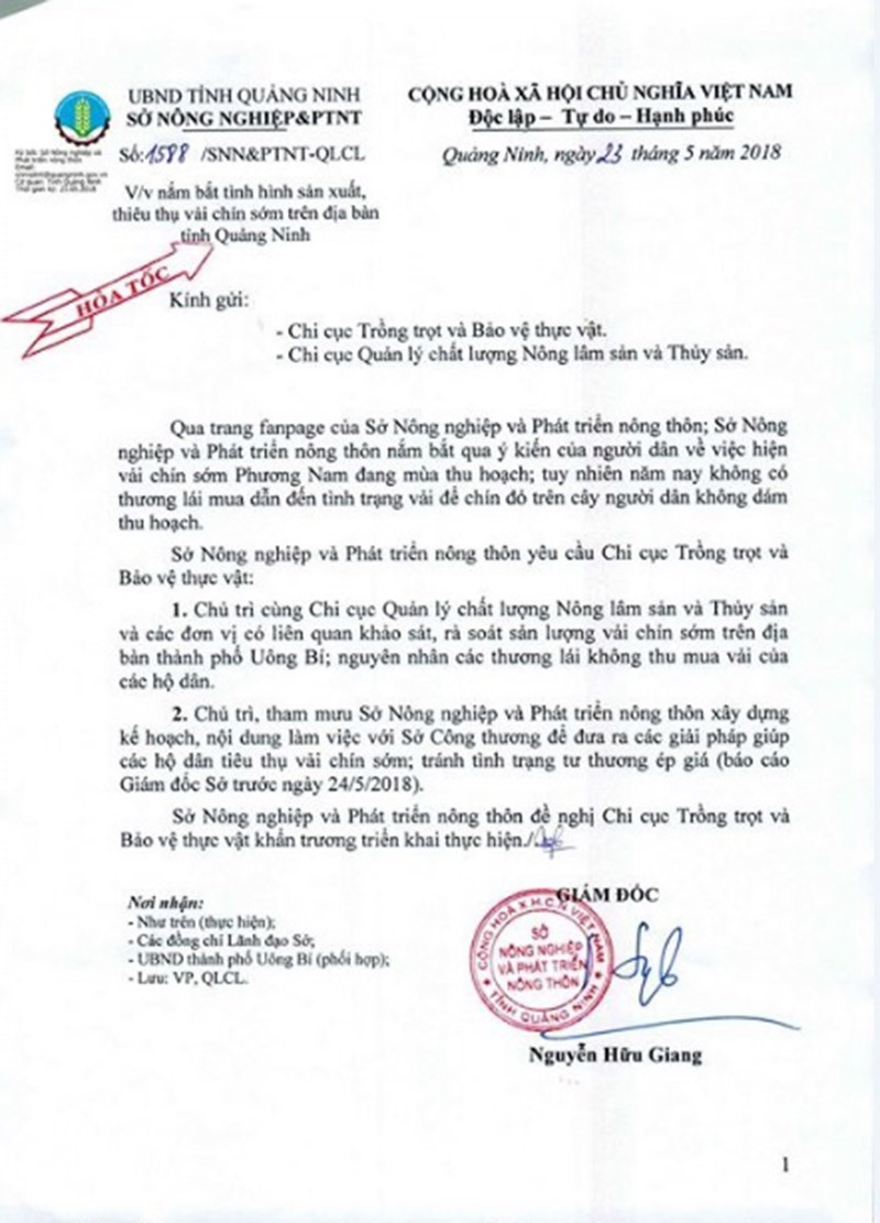 Ngay sau nắm bắt thông tin, ngày 23/5, Sở NN&PTNT đã thành lập đoàn công tác tìm hiểu thực tế tại phường Phương Nam; TP Uông Bí cũng thành lập đoàn khảo sát tình hình tiêu thụ vải tại các vựa vải lớn tại tỉnh Bắc Giang và Hải Dương.