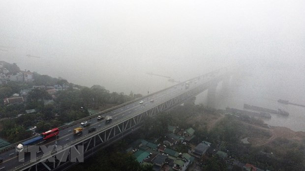 Hình ảnh cầu Thăng Long trong làn mưa bụi. (Ảnh: Huy Hùng/TTXVN)