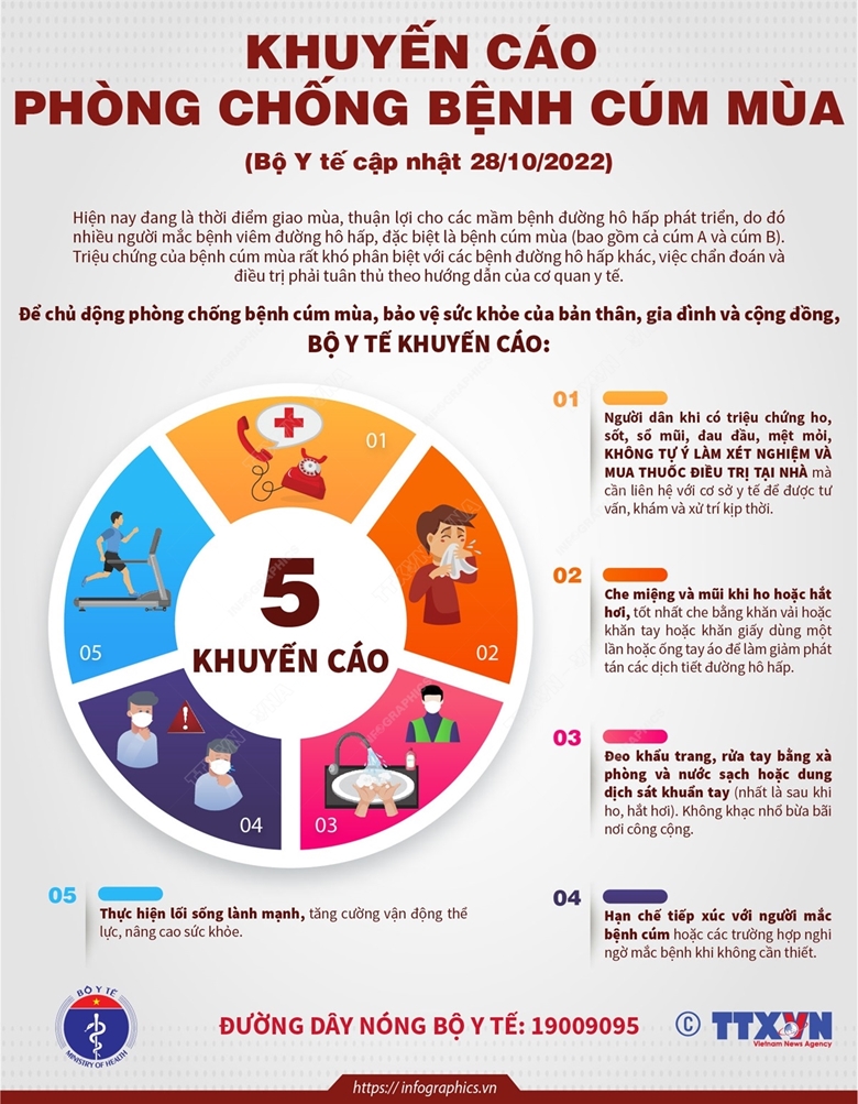 Triệu chứng của bệnh cúm mùa rất khó phân biệt với các bệnh đường hô hấp khác. Việc chẩn đoán và điều trị phải tuân thủ theo hướng dẫn của cơ quan y tế. Để chủ động phòng, chống bệnh cúm mùa, bảo vệ sức khỏe của bản thân, gia đình và cộng đồng, Bộ Y tế khuyến cáo: